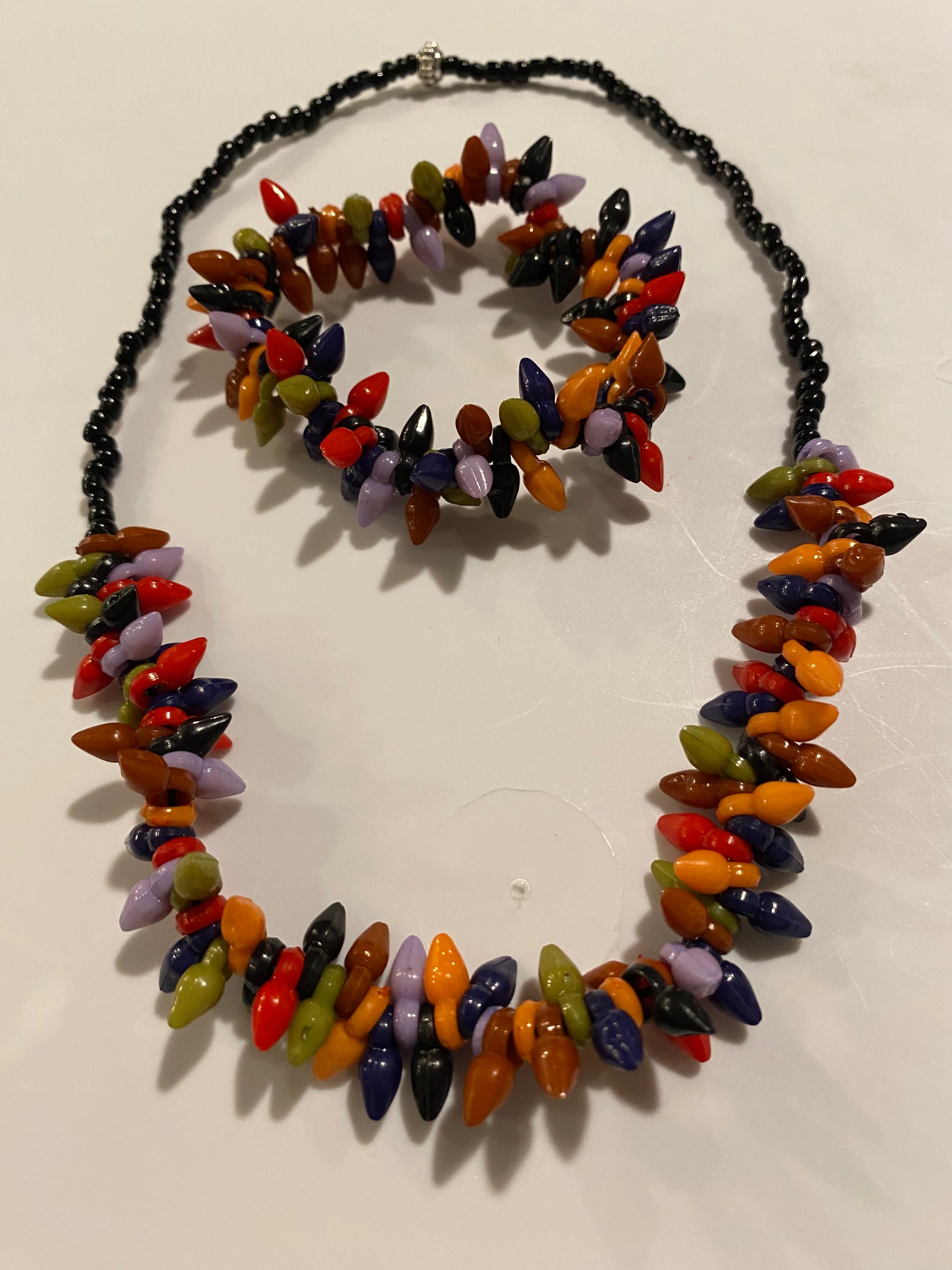 A vibrant handmade set featuring multicolored teardrop beads in bold shades of red, orange, purple, green, and black. Accented with glossy black seed beads, this statement piece adds a lively touch to any outfit. Perfect for festive occasions.