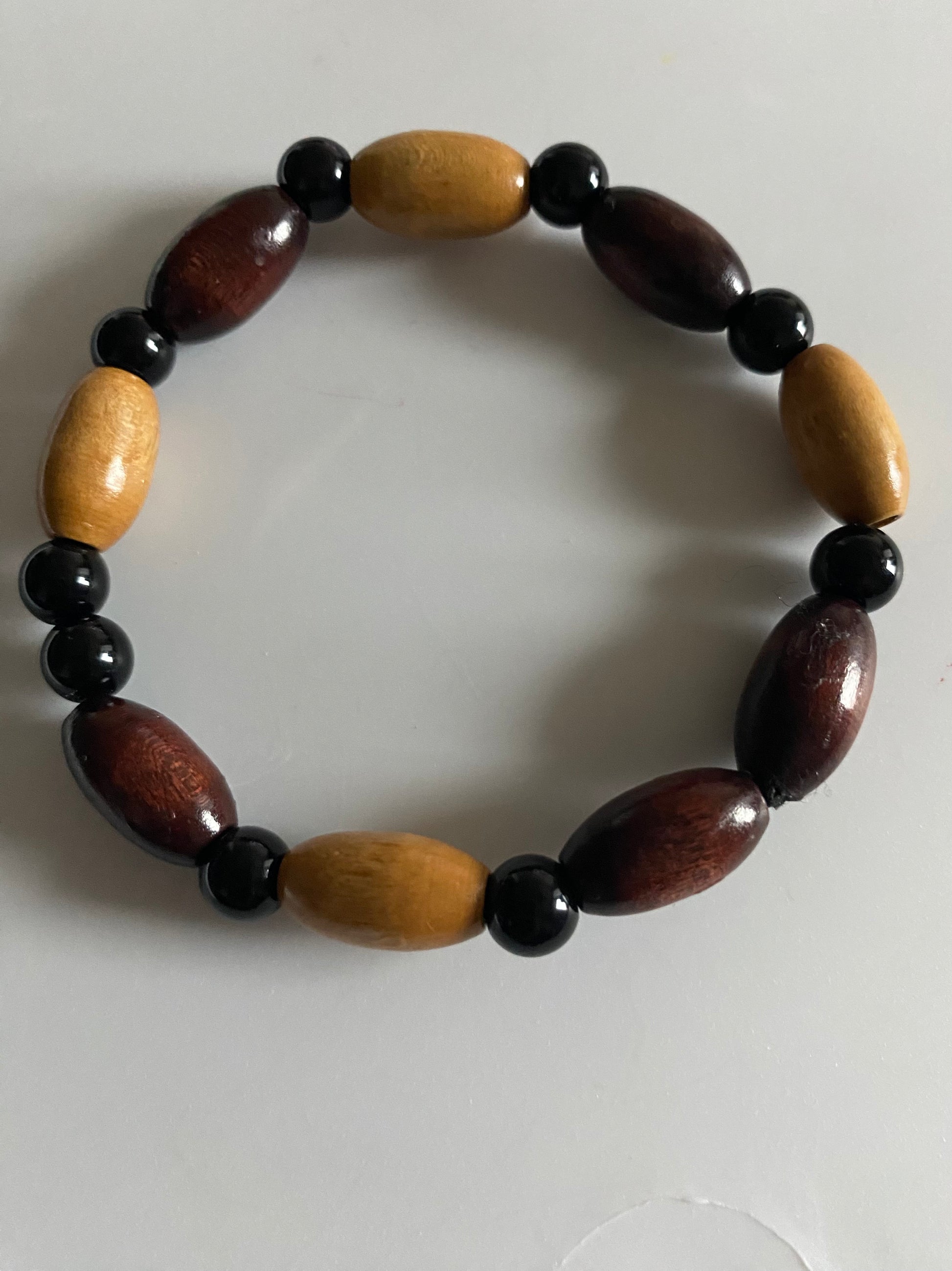 A handcrafted wooden bracelet made with dark and light brown beads, exuding a natural, earthy charm.