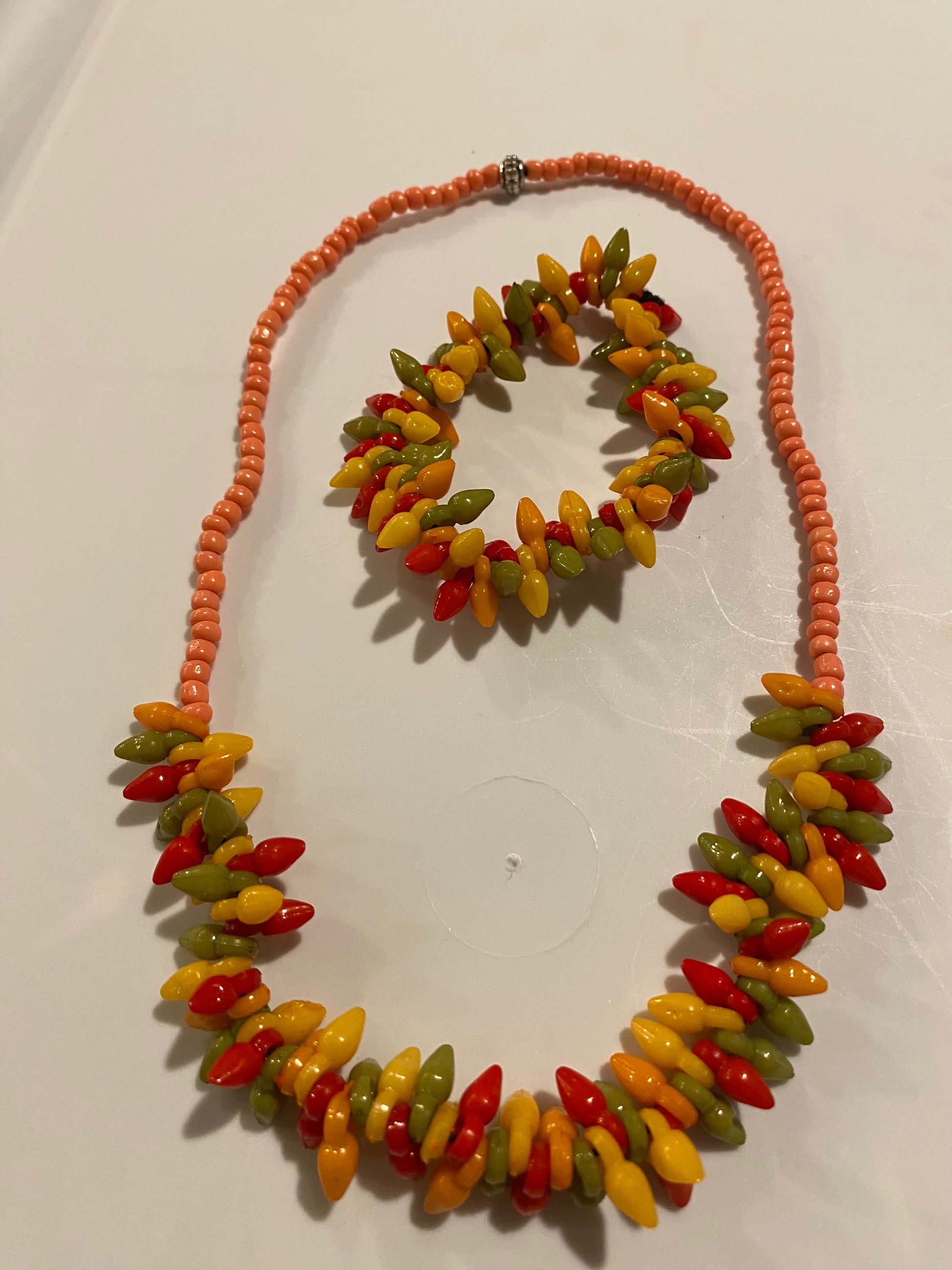 Inspired by autumn hues, this vibrant necklace and bracelet set features warm orange, yellow, and green beads, evoking the colors of a sunset harvest.